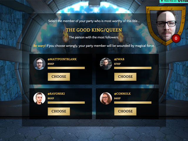 A much-revised Twitter-based game, masterminded by my friend and colleague Joseph Bell and built to allow you to choose your friends (using Twitter's API), enter a dungeon with them and battle monsters and answer questions about them. A BBC Digital Guerrillas project.