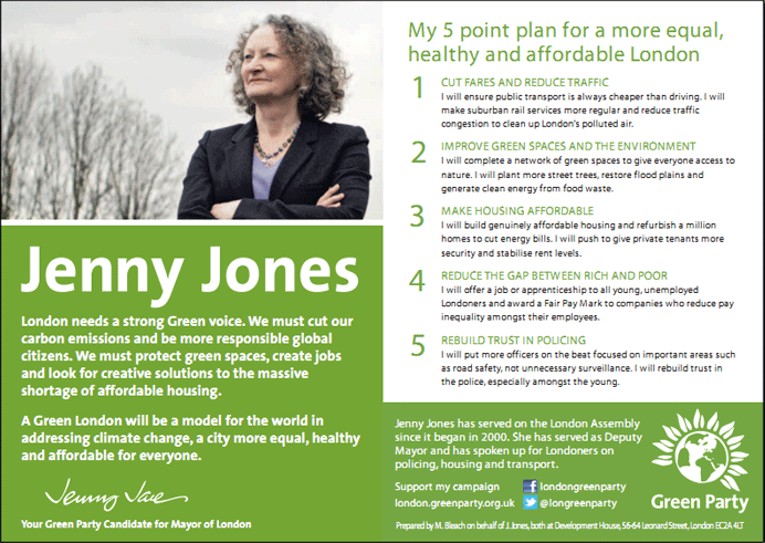 It has to be said: this is the most well-designed of the seven candidates' manifestos. It looks great, gets his name and image across quickly, and incorporates the party colours in a way that's not brash and cartoonish. He also wins some points with me for highlighting the annoyance of having to pay for a second bus journey when the one you're on breaks down or inexplicably stops mid-journey.